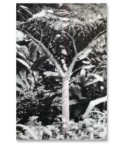 川に向かう土手際には、大型のジンジャーが一部景観を塞いでいるため、基部より20-30cm残して刈り取られている。その中に後から生えたゾウコンニャク(Amorphophallus campanulatus)が高さ2m、巨大な羽状葉を展開している。英名はElephant-foot yam。塊茎には、コンニャクを作るデンプンはないといわれているが、姿形は日本のものと同じで、コンニャクデンプンを含んでいるのではないかと思われる。現地では、若い葉柄を煮て食べる。仏炎苞は平開し、大きな朝顔形で、紫紅色で美しい。これより大きいオオコンニャク(A.giganteus)やスマトラオオコンニャク(A.titanum)もあるが、花は本種が一番美しいとされている。
